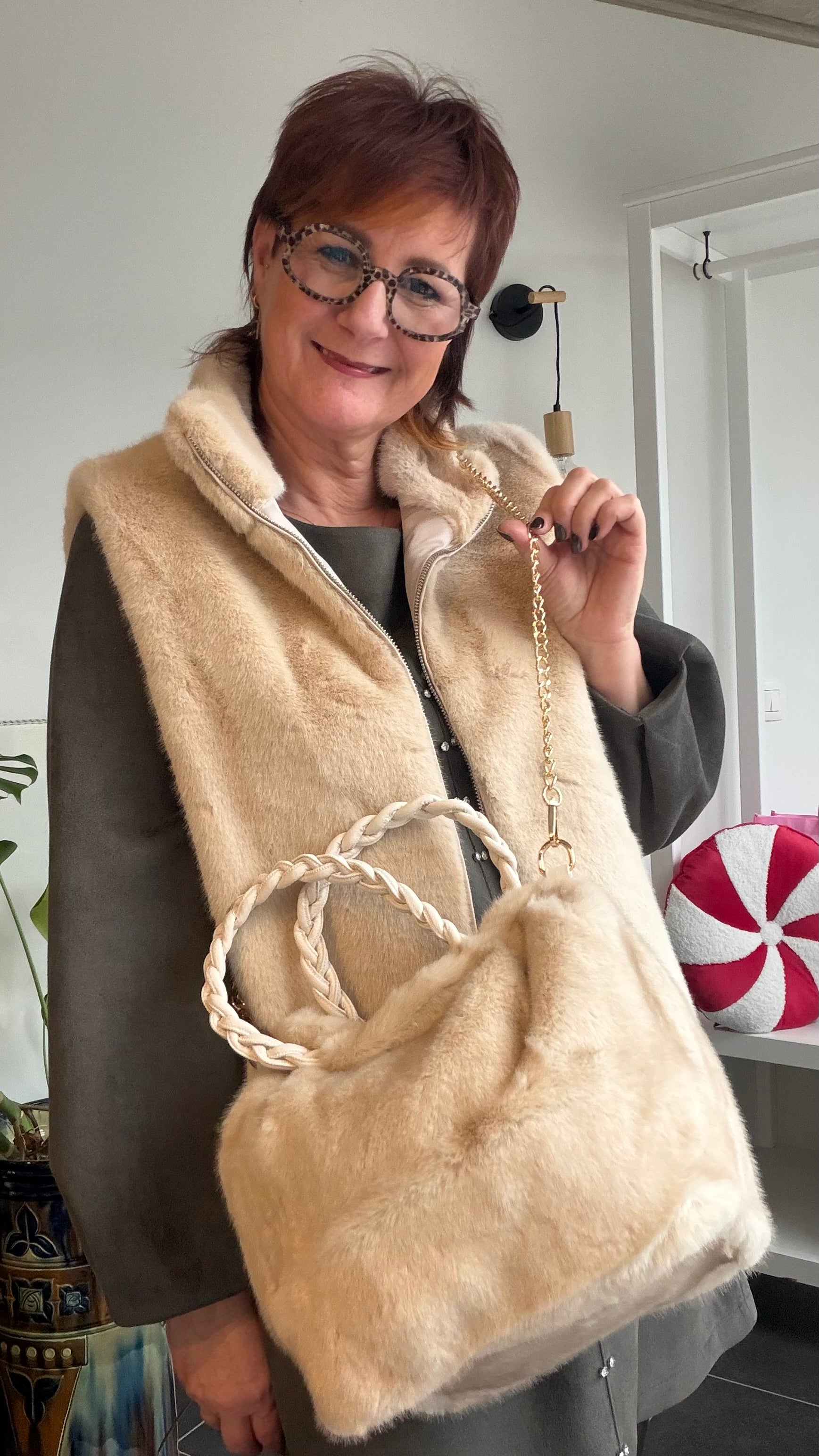 Deze tas is pure cozy luxury. De zachte faux-fur structuur voelt heerlijk aaibaar aan, terwijl de gouden chain en gevlochten handvatten zorgen voor die classy Estudio-touch waar iedereen instant verliefd op wordt.