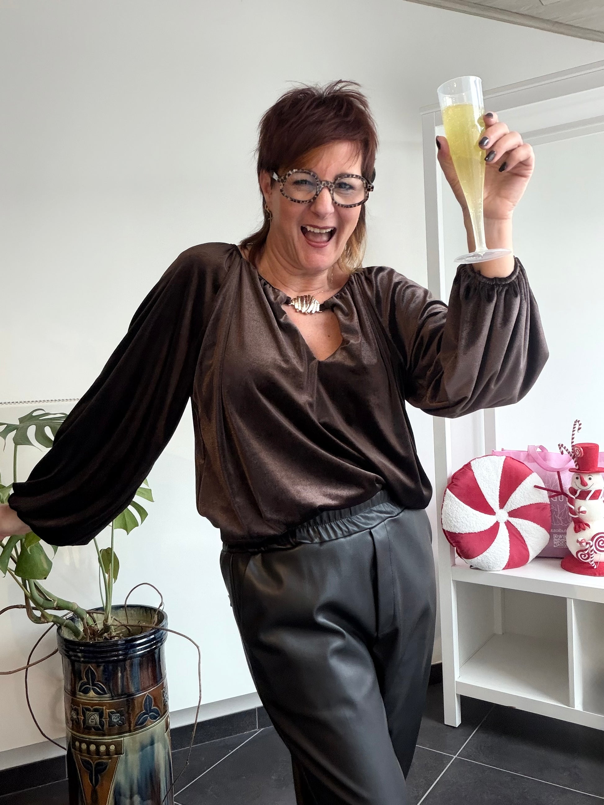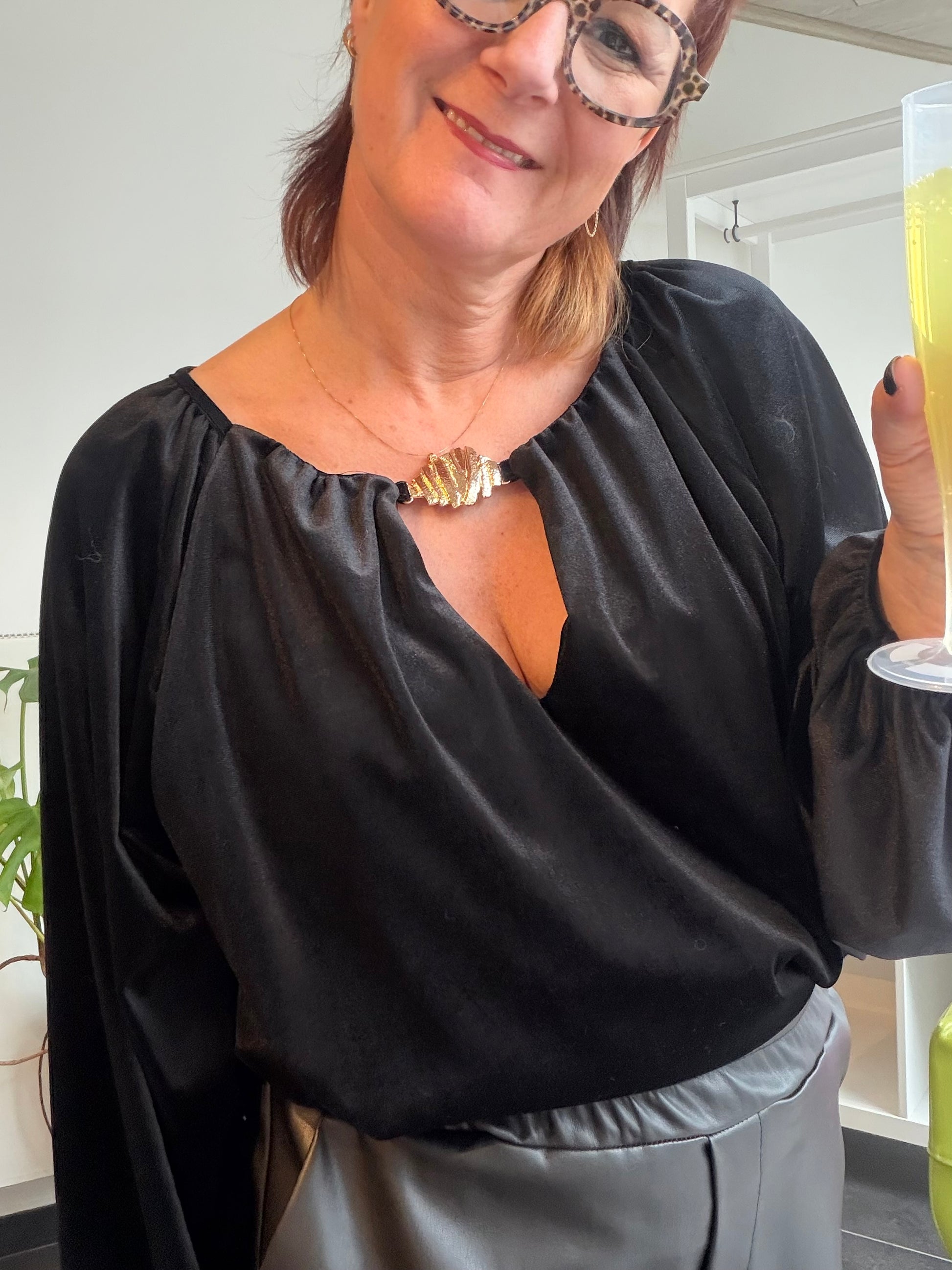 Het luxueuze fluweel vangt het licht op een subtiele, chique manier en de speelse uitsnede aan de hals zorgt voor dat typische Estudio-detail dat meteen wauw zegt.